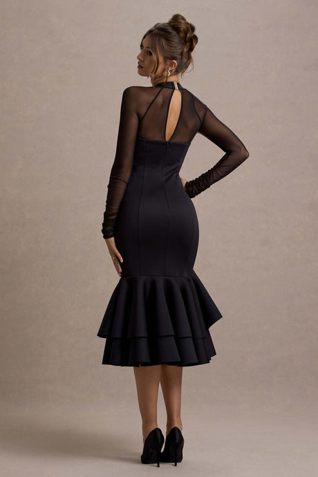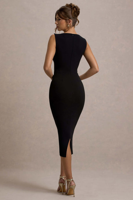 Seductress | Black Velvet Square Neck Bodycon Midi Dress With Long Sleeves