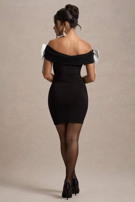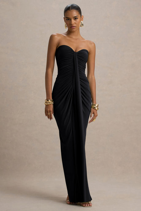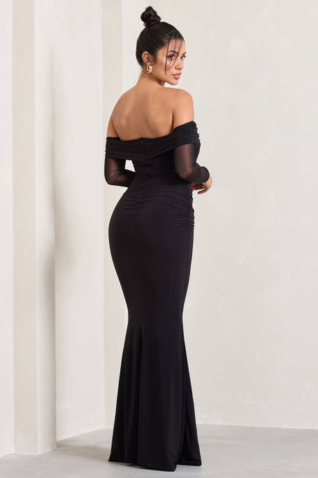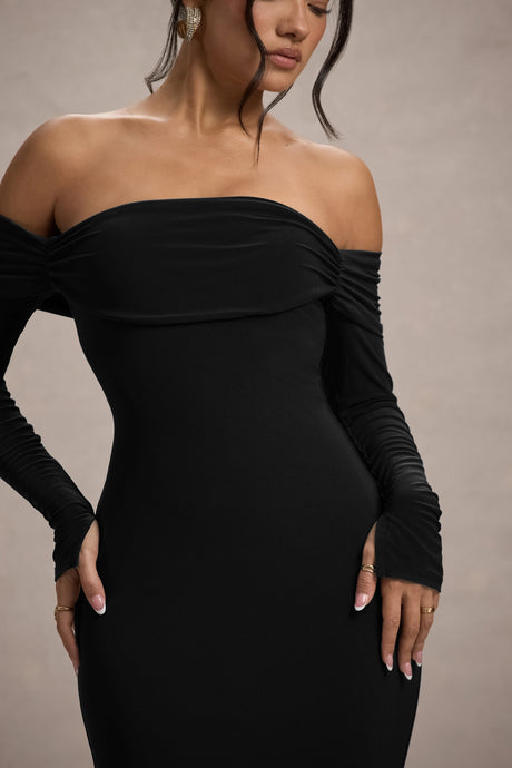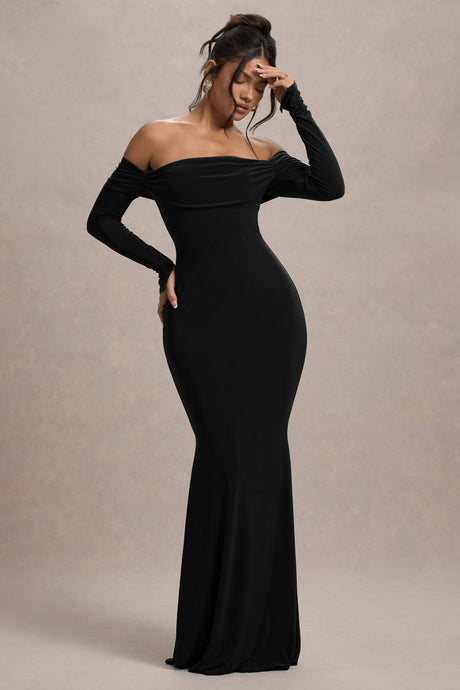 Annie | Black Satin Bardot Maxi Dress With Split Wrap Skirt