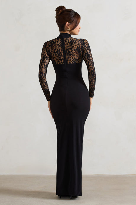Arden | Black High-Neck Split Maxi Dress With Lace Sleeves