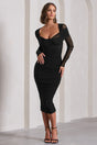 Between The Lines | Black Ruched Mesh Long-Sleeved Bodycon Midi Dress