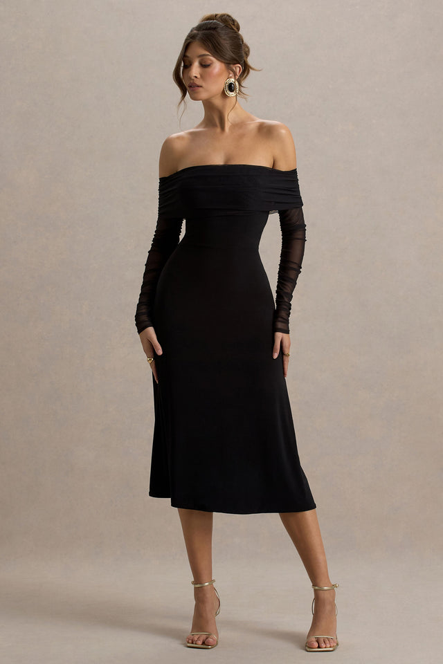 Flatter Me | Black Bardot Midi Dress With Mesh Sleeves