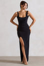 Kate | Black Square Neck Maxi Dress with Plunge Back and Side Thigh Split