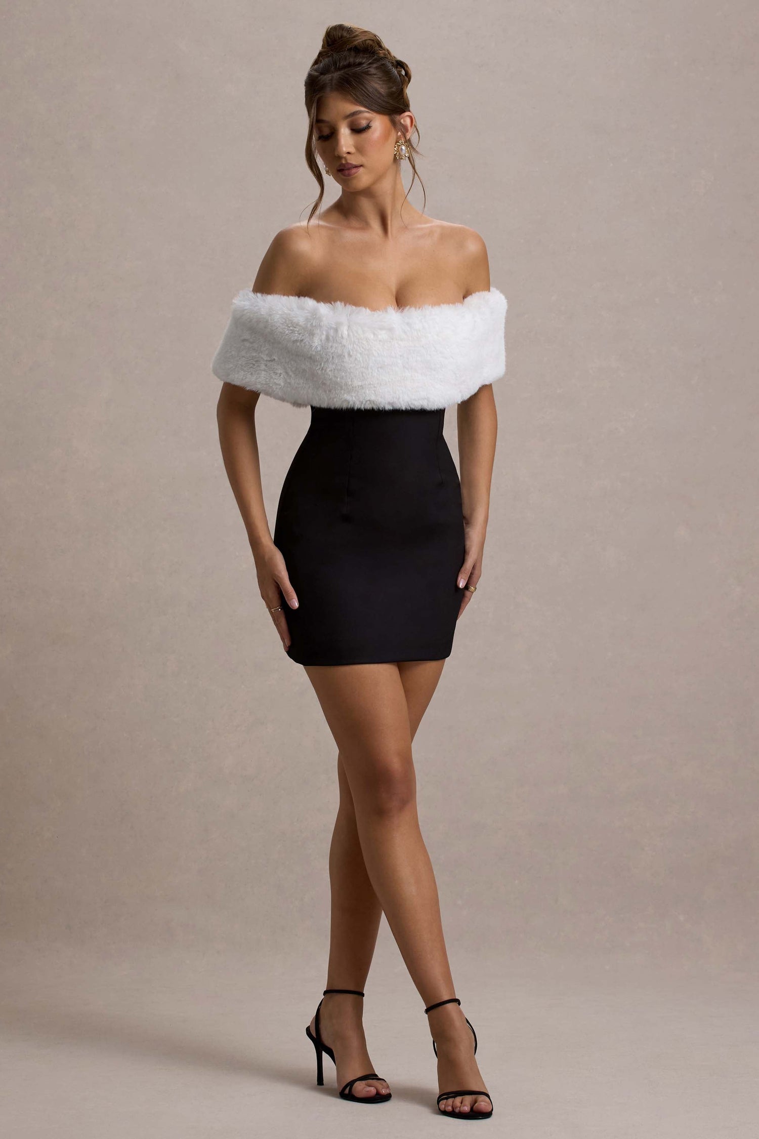Little Luxe | Black Bardot Mini Dress With White Fur Trim - US 2 / BLACK AND WHITE is backordered and will ship as soon as it is back in stock.