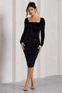 Seductress | Black Velvet Square Neck Bodycon Midi Dress With Long Sleeves